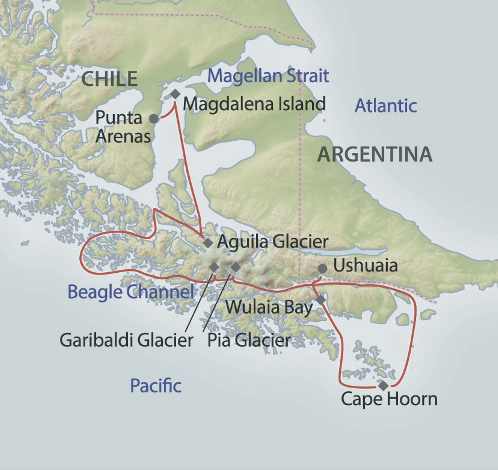 Am Ende der Welt erwartet Sie ein einzigartiges Kreuzfahrtabenteuer an Bord der M/V Stella oder Ventus Australis. Häufig von Delfinen begleitet, kreuzen Sie durch die Magellanstraße und den Beagle-Kanal und passieren dabei mächtige Gletscher, die in allen Blautönen leuchten. Der kräftige Wind peitscht bizarre Wolkenformationen vor sich her, die im Spiel mit Licht und Schatten eine ganz besondere Atmosphäre schaffen. Am sagenumwobenen Kap Hoorn werden Sie an Land gehen und auf täglichen Wanderungen und Zodiacfahrten diese unberührte und majestätische Urlandschaft aus nächster Nähe erleben.