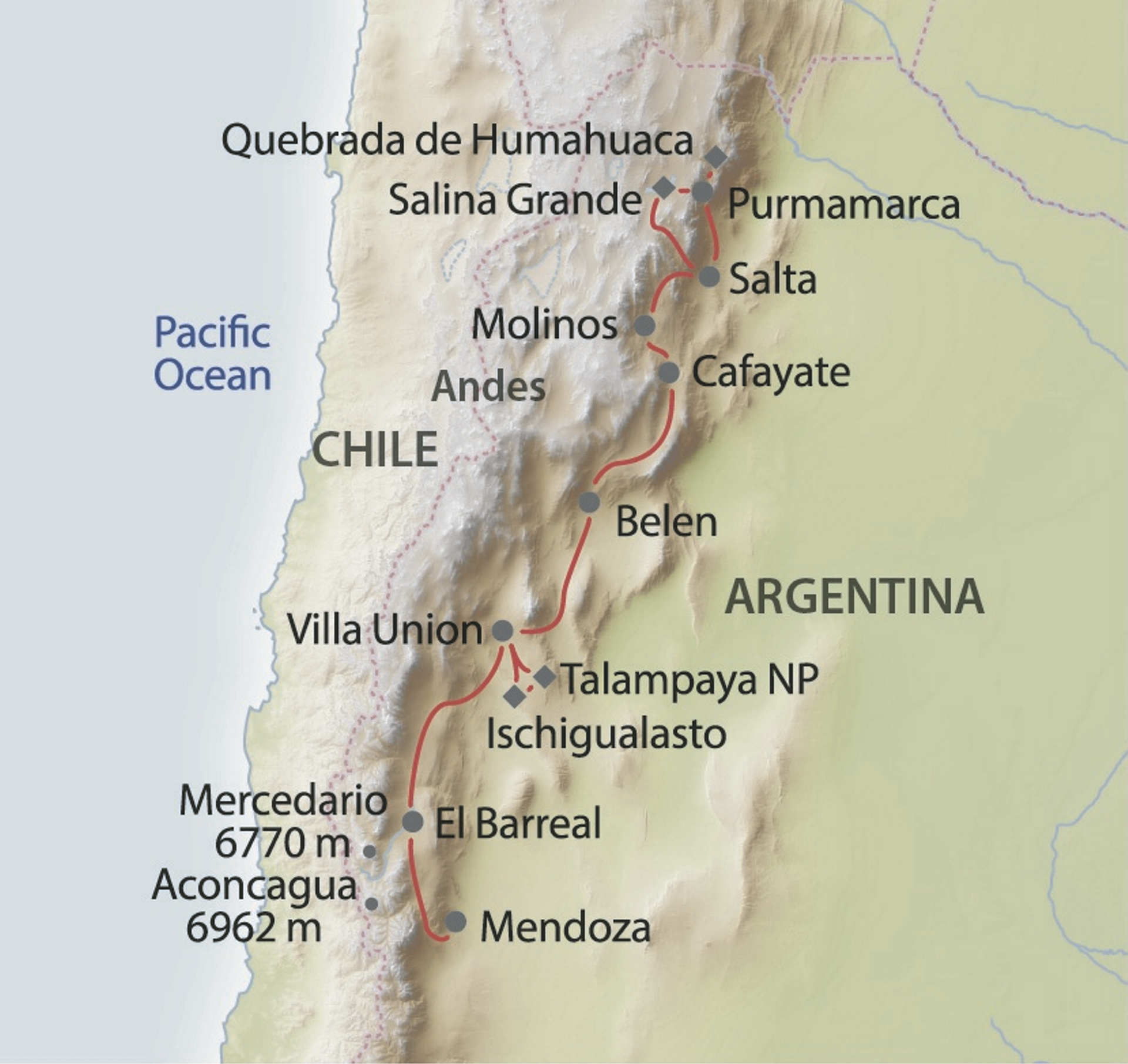 Die Fahrt entlang der Anden im Nordwesten Argentiniens ist immer noch ein Geheimtipp, wenn Sie abseits vom Massentourismus unterwegs sein möchten. Erleben Sie einen abwechslungsreichen und faszinierenden Teil Argentiniens. Fruchtbare Täler, koloniale Städte, authentische Dörfer, Salzseen, Wüsten, Schluchten, leuchtende Felsformationen, großartige Nationalparks und die immer gegenwärtige Andenkette werden Sie auf dem Weg von Mendoza nach Salta begleiten.