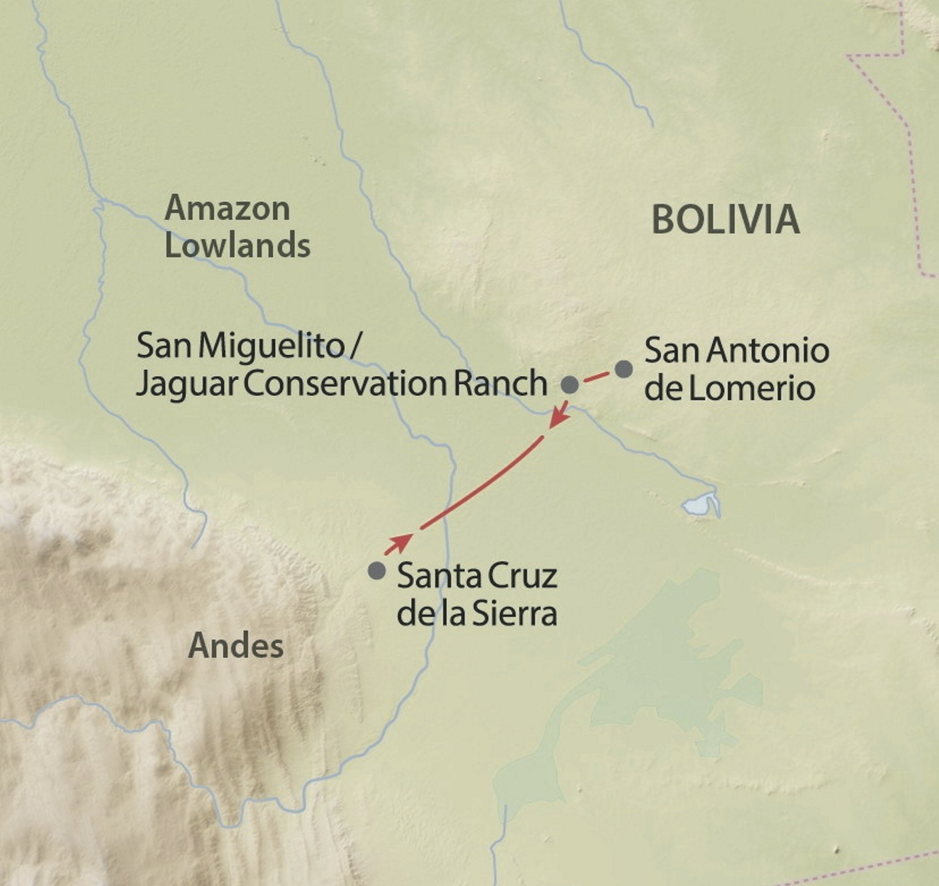 Am San Julian Fluss erleben Sie den Sonnenaufgang und unternehmen eine Bootsfahrt zur Tierbeobachtung. In diesem Gebiet werden am häufigsten Großkatzen gesichtet. Nach dem Frühstück besteht die Möglichkeit zu einer kurzen Wanderung zu einem Aussichtspunkt mit herrlichem Ausblick über die Tiefland-Region. In der Ranch essen Sie noch zu Mittag, bevor Sie wieder zurück nach Santa Cruz fahren. Abreise oder individuelles Anschlussprogramm.