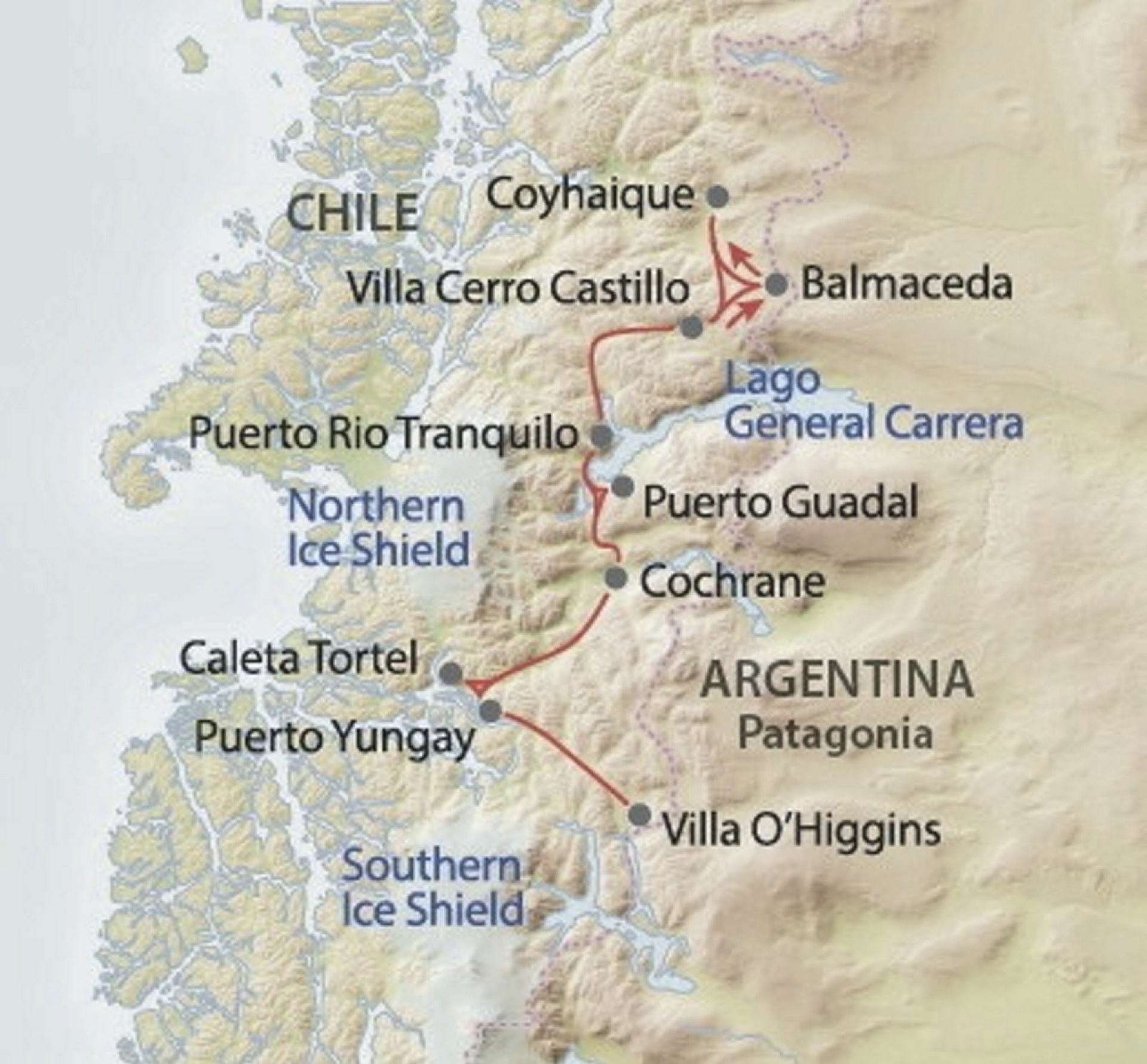 Erkunden Sie die Umgebung dieser außergewöhnlichen Siedlung. Ein Wanderweg im Naturpark „Parque Glaciar Mosco“ führt Sie zum Aussichtspunkt Mirador del Valle mit Blick auf den Huemula-Gletscher, den Zusammenfluss der Flüsse Mosco und Mayer und auf die Seen O’Higgins und Ciervo (5 km, 300 Höhenmeter, Gehzeit ca. 3 Std.). Ein Abstecher zum Endpunkt der bekannten Carretera Austral, einer der landschaftlich schönsten Straßen der Erde, sollte in jedem Fall auf Ihrem Tagesprogramm stehen. Ein Tipp ist die Bootsfahrt zum spektakulären O’Higgins-Gletscher (Dauer ca. 10-11 Stunden). Tickets sind am Vortag im Ort erhältlich, allerdings findet die Fahrt nur bei günstiger Witterung statt.