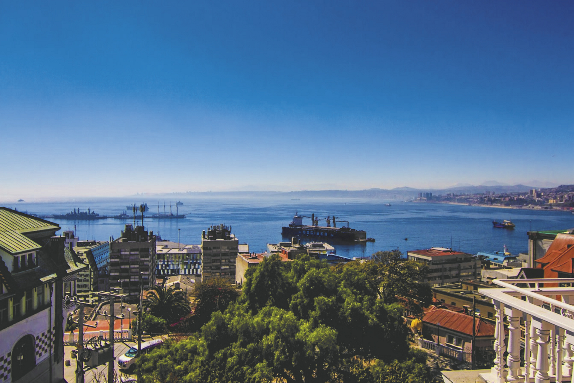 Auf einem Hügel im historischen Stadtteil mit Blick auf die bunten Häuser der Altstadt und die Bucht.