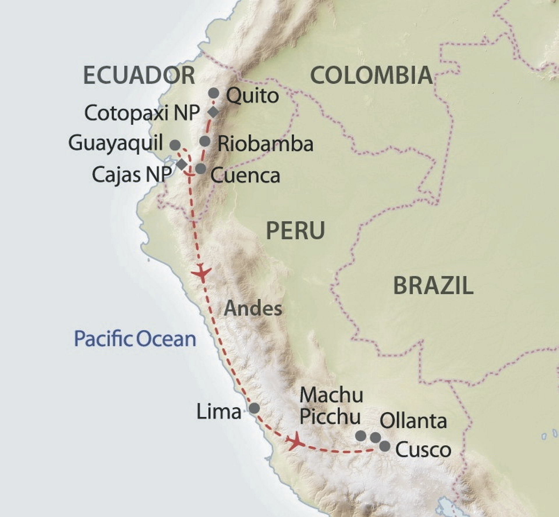 Mit dem Transfer zum Flughafen endet Ihre Reise durch Ecuador und Peru. Wenn Sie mehr Zeit zur Verfügung haben, können wir selbstverständlich den Aufenthalt in Ecuador und/oder Peru mit anderen interessanten Punkten ergänzen.
