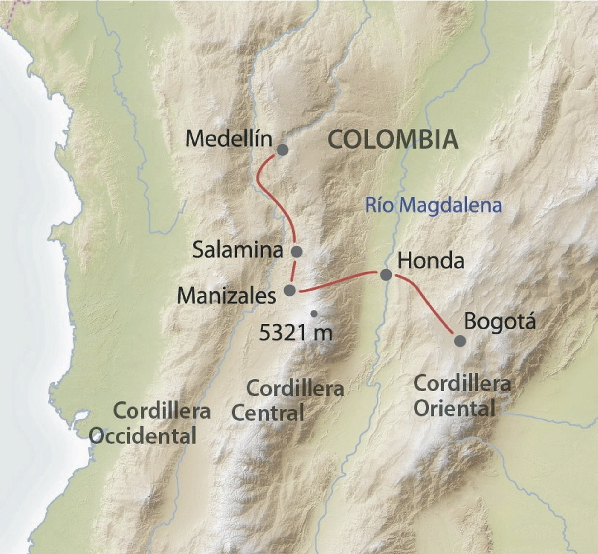 Die Strecke zwischen Salamina und Medellín ist geprägt von den steilen grünen Berghängen und dem tiefen Tal des Río Cauca. Serpentinen mit herrlichen Ausblicken wechseln sich ab mit der Durchquerung der tiefen Täler und der Nebenflüsse des Cauca. 2 Ü: Casa Lola Boutique Hotel.