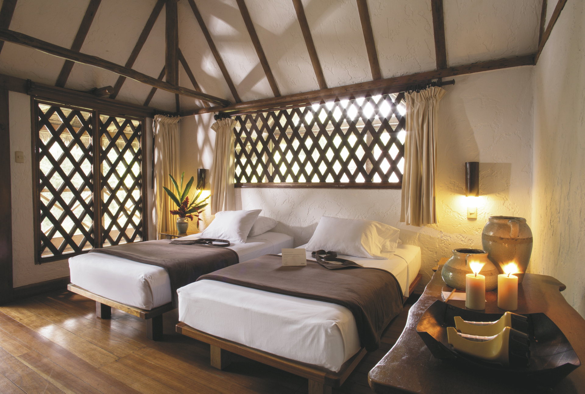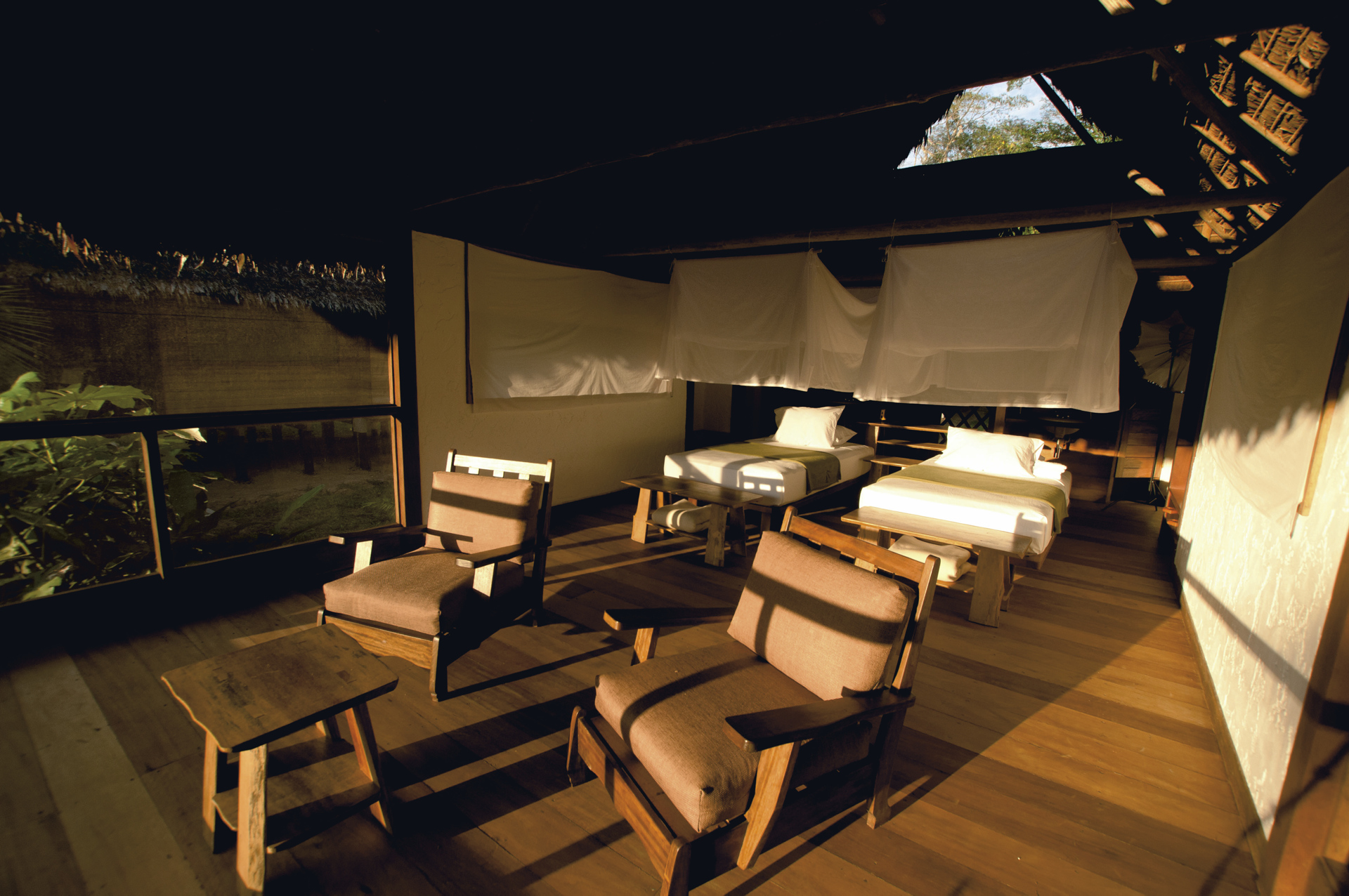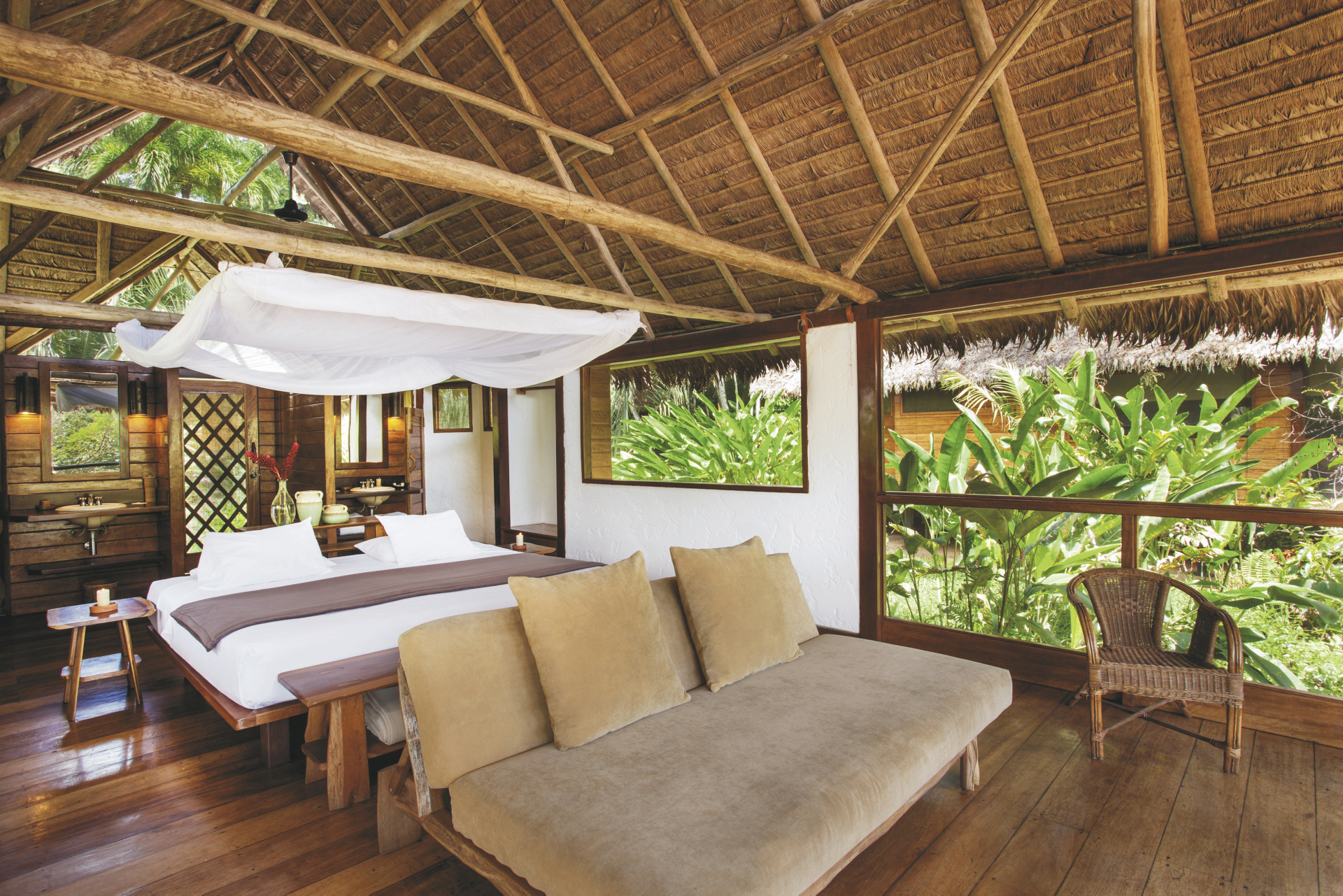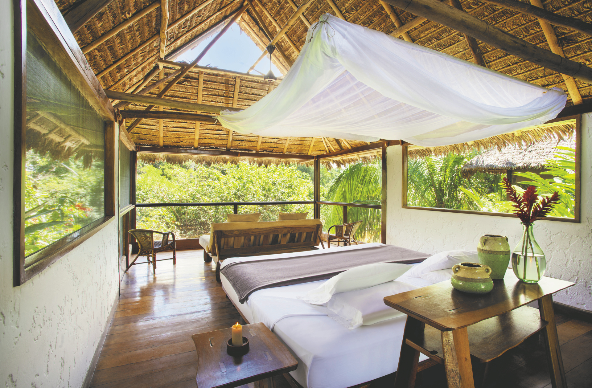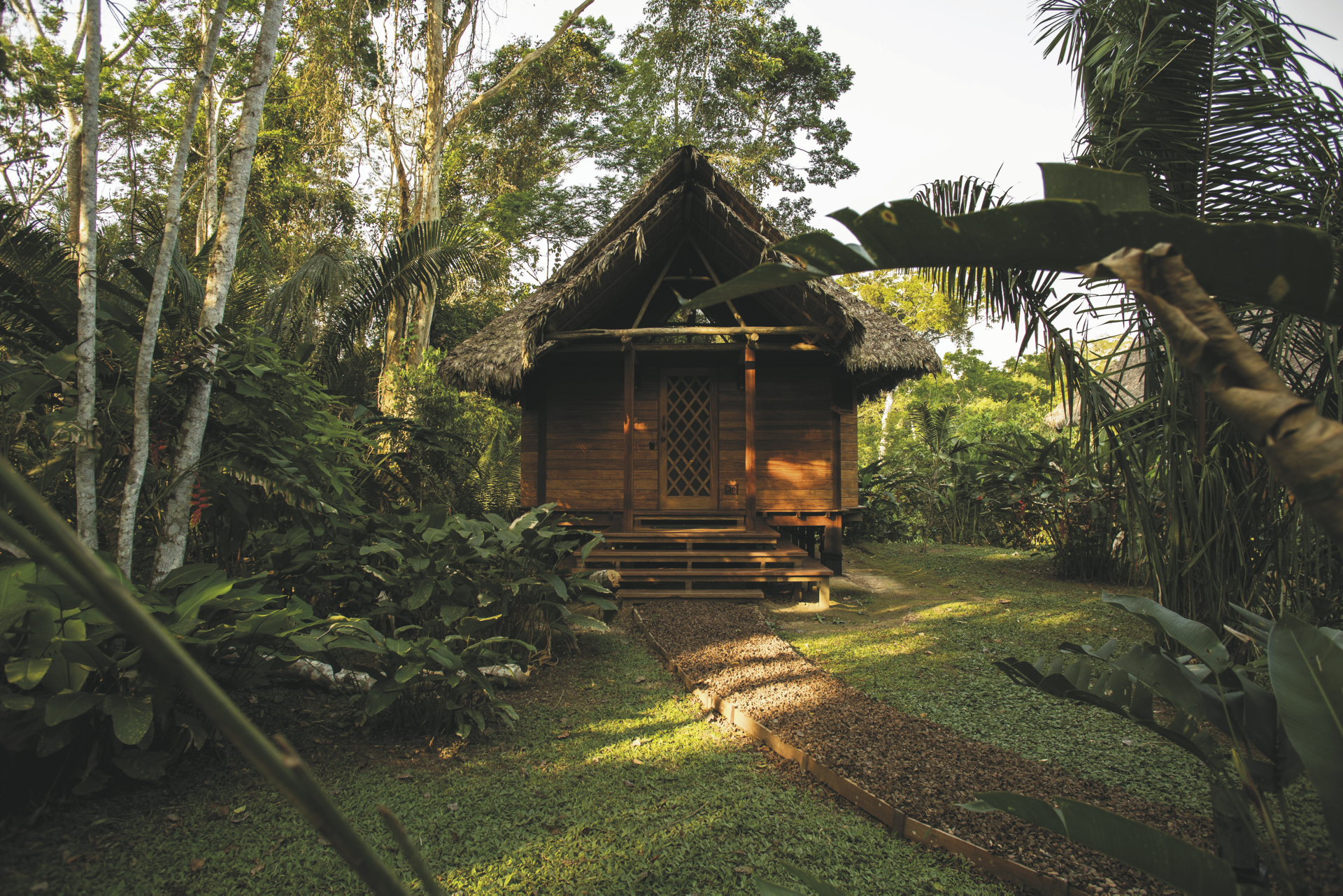Das Design der 19 geräumigen Cabanas kombiniert rustikalen Regenwaldstil mit modernen Elementen. Sie sind ausgestattet mit einem Deckenventilator, Leselicht, Sitzecke, Hängematte, Moskitonetzen und einem Bad mit DU/WC.