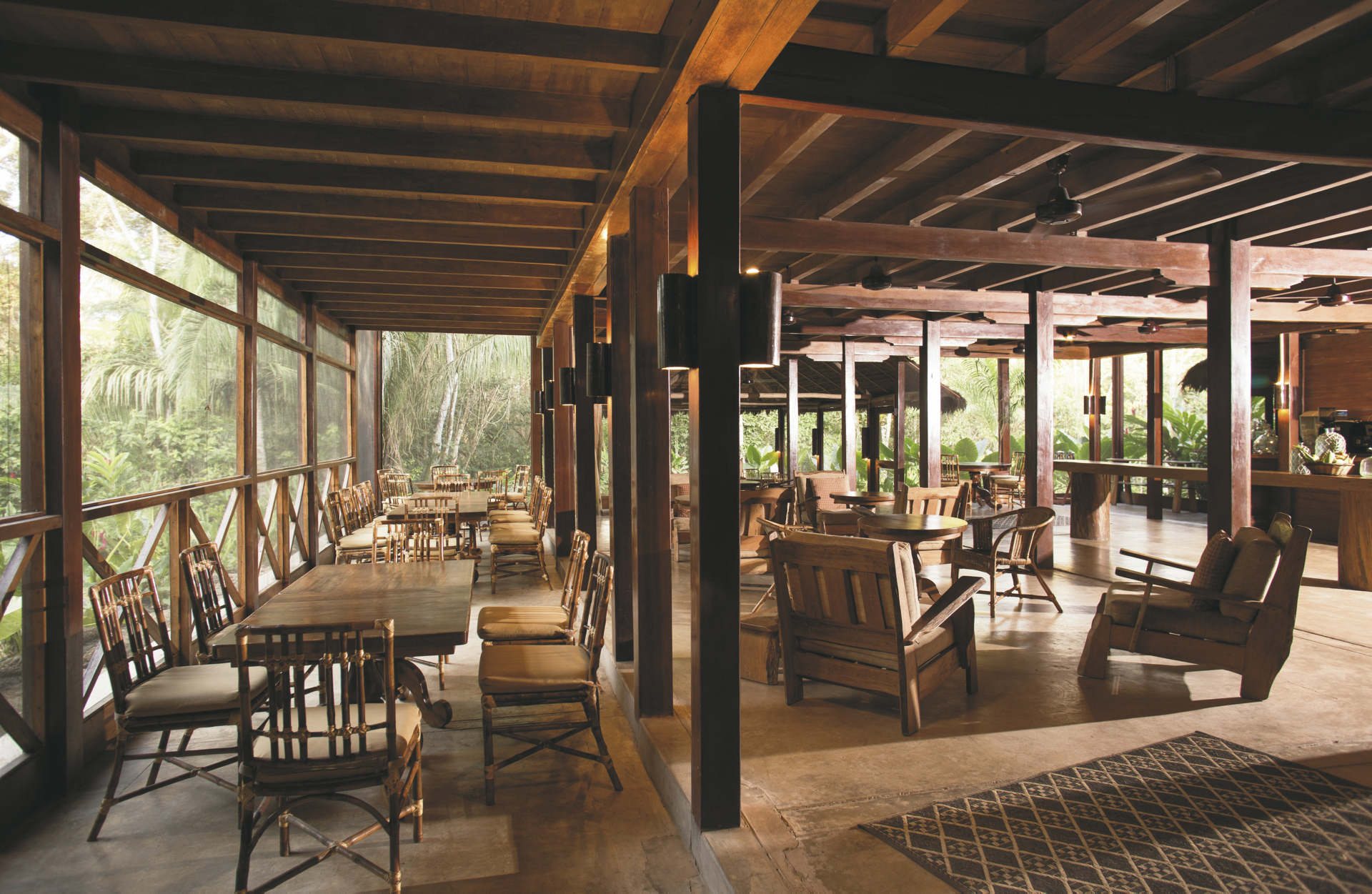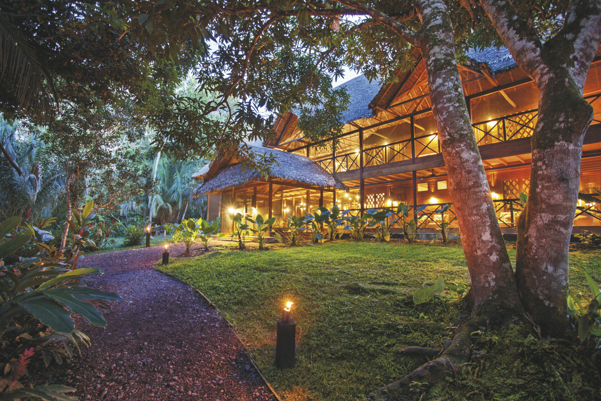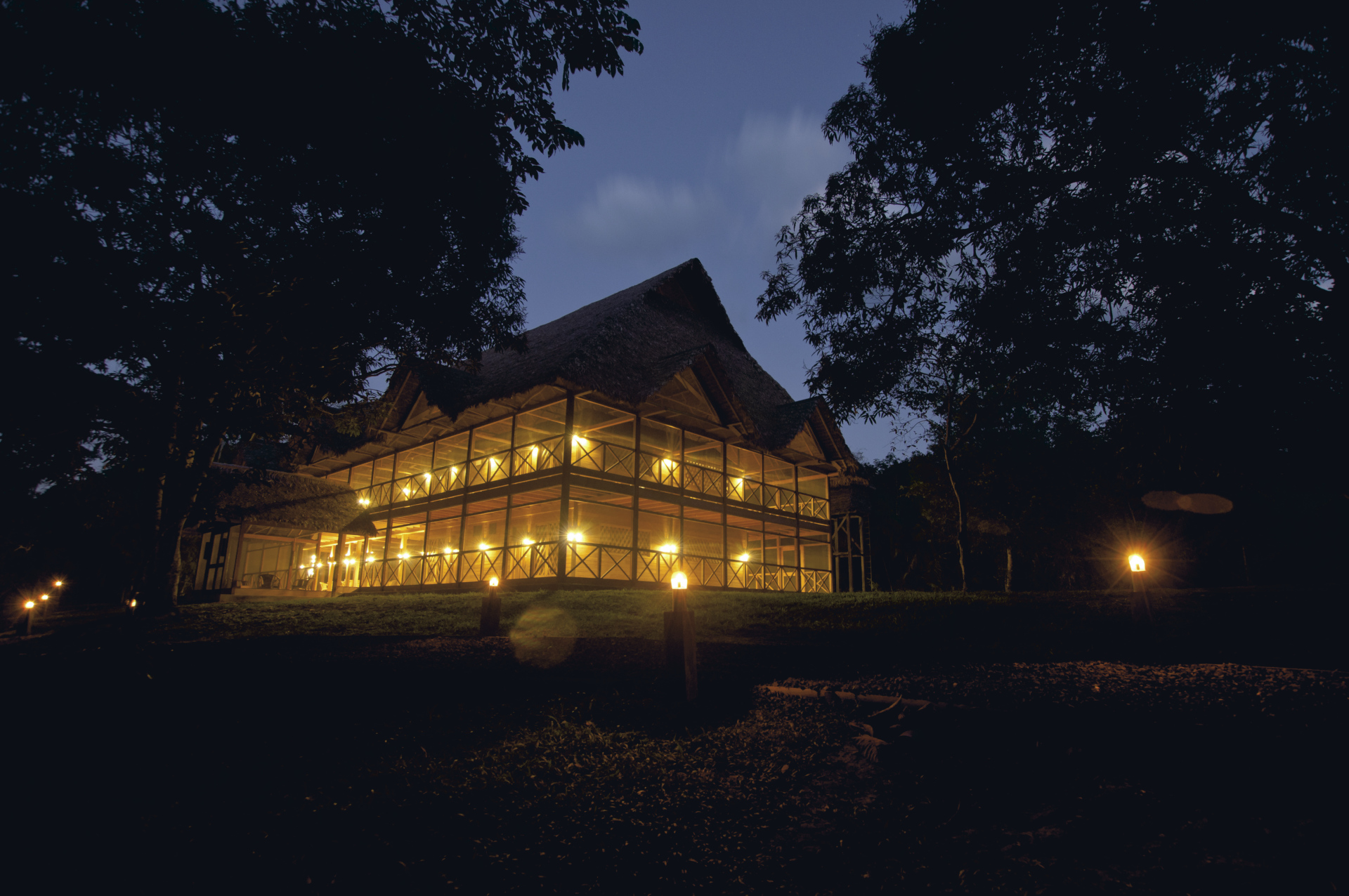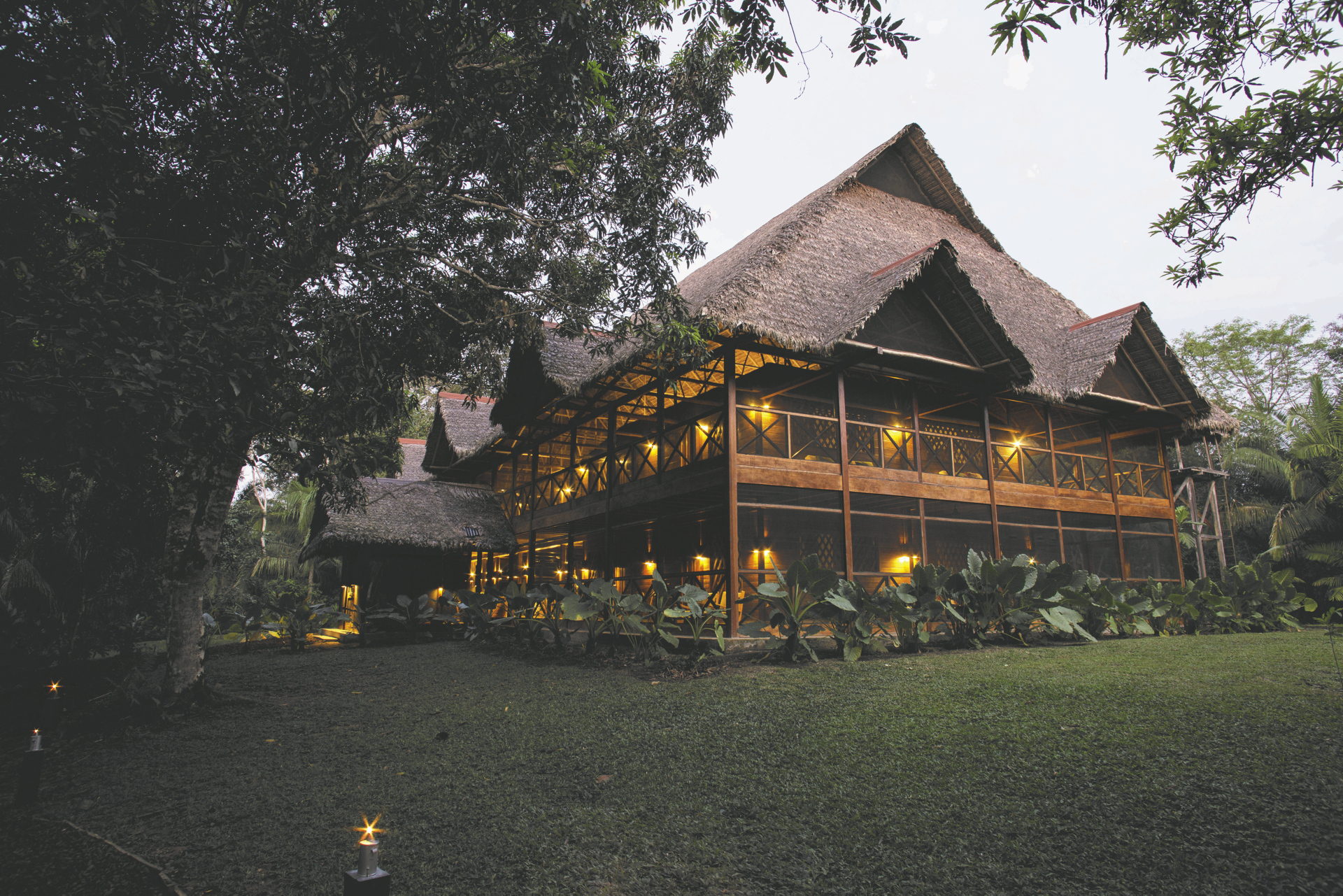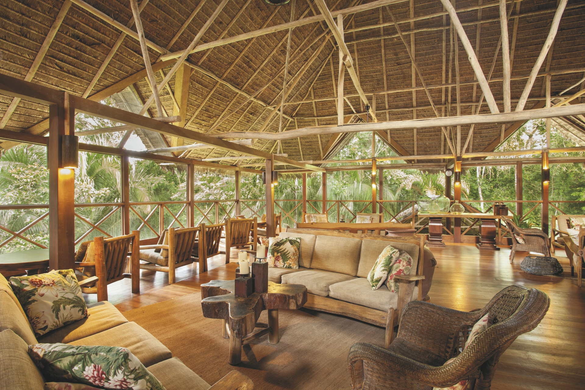 Die Lodge ist im Amazonasstil erbaut. Im Haupthaus mit seinen hohen Decken befinden sich die Rezeption, das Restaurant und die Bar.
